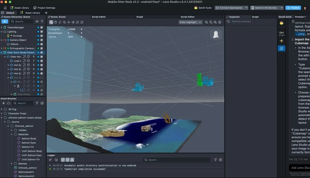 The experience was brought to life in Snapchat's Lens Studio — translating design concepts and 3D assets into a fully interactive AR experience across mobile and Snap Spectacles, from the tide pools to the whale breaching finale.